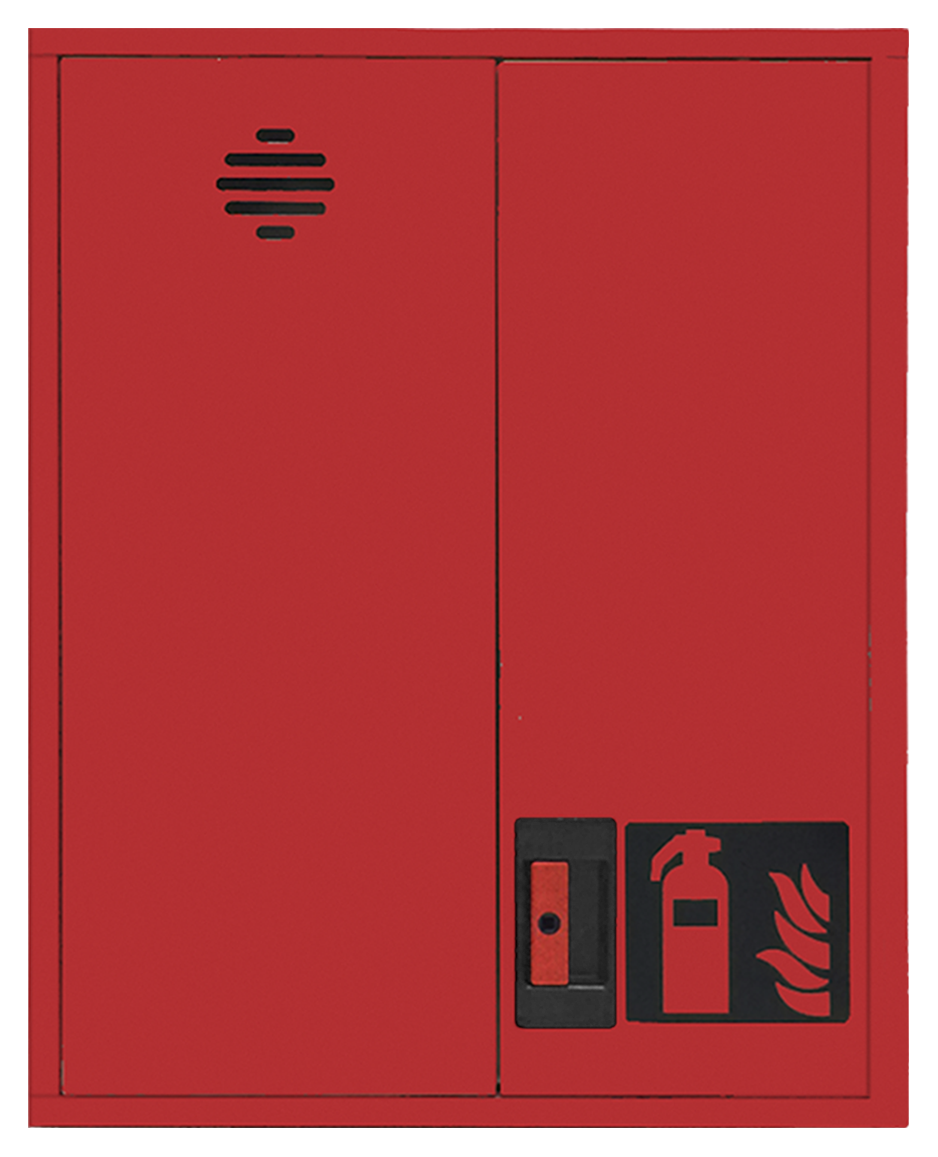 • Armario modular con capacidad para alojar extintor de polvo ABC de 6kg o extintor de CO2 de 2kg, y panel técnico para colocar elementos varios como pulsador, sirena, luz de emergencia
